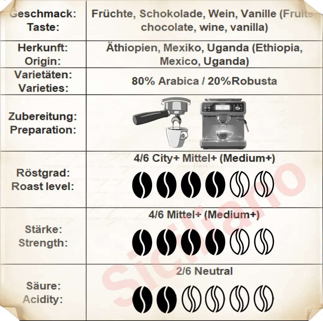 Unser Kaffee wird für Sie mit allen Traditionen Siziliens geröstet. Das Rezept für diesen Kaffee wurde in Zusammenarbeit mit Spezialisten aus Sizilien entwickelt. Er zeichnet sich durch einen milden, vollmundigen Geschmack und ein kräftiges Aroma aus.