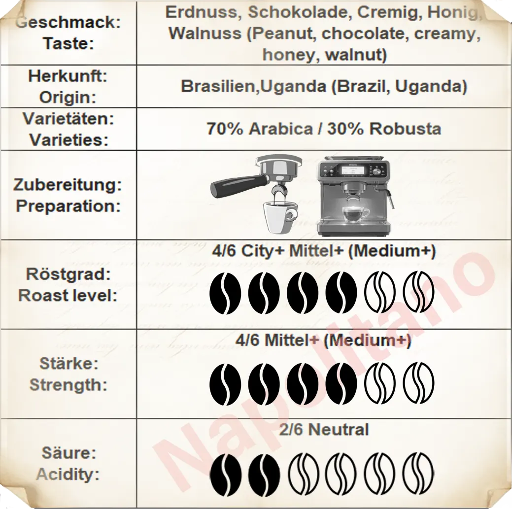 Unser Kaffee wird für Sie mit allen Traditionen Neapel geröstet. Das Rezept für diesen Kaffee wurde in Zusammenarbeit mit Spezialisten aus aus Neapel entwickelt. Er zeichnet sich durch einen milden, vollmundigen Geschmack und ein kräftiges Aroma aus.