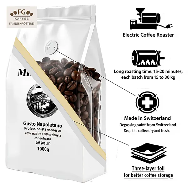 - Unsere Kaffeeverpackungen sind mit einem mit einem Schweizer Ventil des besten Herstellers Wicovalve ausgestattet, um die Frische und das Aroma zu bewahren.