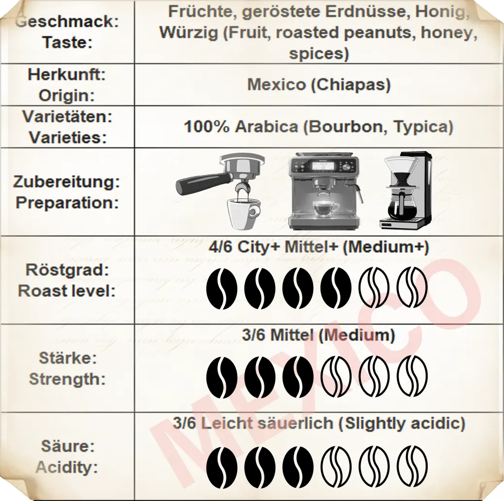 Kaffee aus Mexiko hat eine angenehme Säure und eine mittlere Bitterkeit mit einem deutlichen Schokoladen-Nachgeschmack. Das Aroma dieses Kaffees hat Noten von Nüssen und Früchten, insbesondere von Zitrusfrüchten. Die fortgeschrittene Röstung des Espresso verleiht dem Kaffee ein unvergessliches Erlebnis.