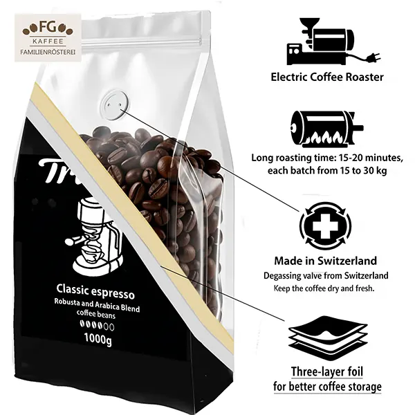 - Verpackung unmittelbar nach dem Rösten in 3-lagiger Folie des weltweit führenden Herstellers Amcor.